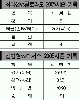 최희섭으로선 콜로라도 원정이 부활을 위한 절호의 기회가 될 전망이다.‘투수들의 무덤’인 쿠어스필드에선 비거리가 3∼4m 늘어나 최희섭 같은 퍼올리는 타자에겐 날개를 달아줄 수 있다. 더군다나 잠수함 투수가 왼손타자의 ‘밥’이란 것은 야구계의 정설. 또한 최희섭은 서재응을 상대로 8타수 4안타, 김선우(28·워싱턴 내셔널스)에겐 3타수 1안타 등 한국투수를 만나면 불방망이를 휘둘러왔다. 고교 2년간 한솥밥을 먹어 서로 너무나 잘 아는 김병현-최희섭의 대결이 ‘윈윈게임’으로 끝날지, 상대를 ‘그로기상태’로 몰아갈지 궁금하다.