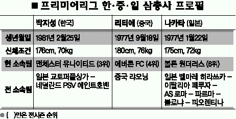 최선참은 중국 대표팀의 수비형 미드필더 리티에(28·에버튼). 브라질 유학파인 리티에는 중국 C-리그 랴오닝에서 뛰던 2002년 리그 최우수선수(MVP)에 오른 특급선수다. 같은 해 한·일월드컵에서 맹활약한 뒤 에버튼으로 이적했다. 첫 시즌 29경기에서 3어시스트를 기록한 그는 지난해 1월 다리골절 부상을 입었지만 지난 10일 울버햄튼과의 프리시즌 경기에서 풀타임을 소화하며 인상적인 활약을 펼쳐 올시즌 전망을 밝게 했다.