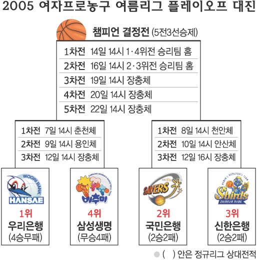 하지만 삼성생명은 득점(20.85점)과 스틸(2.20개) 부문 1위를 차지한 여름리그 최고의 외국인선수 아이시스 틸리스와 최강 포워드 변연하(15.4점)-박정은(15.0점) 트리오가 반전에 앞장 선다. 이미선의 공백 역시 변연하와 박정은이 번갈아가며 훌륭히 메우고 있다. 단기전을 감안하면 ‘반란’ 가능성은 충분하다.