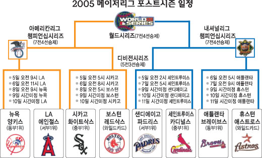 3일 보스턴과 휴스턴이 나란히 마지막 남은 와일드카드를 획득,8장의 티켓 주인이 가려지면서 6개월 동안의 페넌트레이스 대장정을 마친 미프로야구 메이저리그가 5일부터 가을잔치의 막을 올려 2005년 챔프를 가린다.