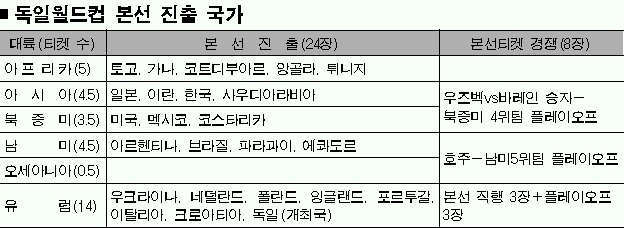 남미에서는 5위 자리를 놓고 우루과이(승점 22), 콜롬비아·칠레(이상 승점 21)가 경합 중이다.5위가 되더라도 히딩크 감독이 이끄는 호주와 최종 플레이오프를 치러야 하는 첩첩산중의 일정이 기다리고 있다.