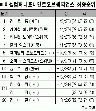 한편 첫날 상위권에 대거 포진했던 ‘토종’ 한국 선수들은 부진했다. 사흘 내내 10위권을 맴돌던 강수연(29·삼성전자)은 2타를 줄였지만 합계 6언더파 282타로 공동 12위에 그쳤고, 박희정(25·CJ) 장정(25) 한희원(27·휠라코리아) 등도 모두 한 자릿수 순위에 들지 못했다.