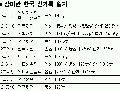 이처럼 장미란은 일찌감치 국내 무대를 평정했고 세계무대에 도전해왔다. 그의 최고 기록은 합계 302㎏. 연습 때 곧잘 306㎏ 이상을 들어올려 세계기록 전망도 밝다. 현재 그와 겨룰 만한 상대는 찾아보기 힘들다.