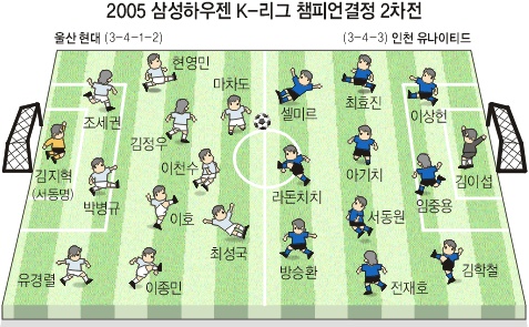 한 판만 남았다. 울산과 인천이 4일 오후 2시 울산 문수월드컵경기장에서 열리는 챔피언결정전 2차전에서 2005프로축구 K-리그 정상을 두고 최후의 사투를 벌인다.