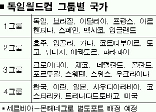 한국이 2006독일월드컵축구 본선 조 추첨을 나흘 앞둔 6일 기대와는 달리 4그룹에 배정됐다.4그룹은 아시아 4개국과 북중미 3개국으로 짜여졌다. 세르비아-몬테네그로가 낮은 FIFA 랭킹 때문에 별도 포트에 배정되는 바람에 일단은 7개국.