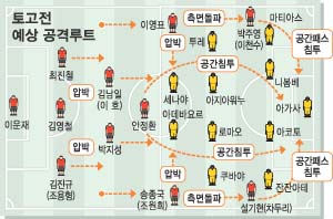 토고의 가장 큰 약점은 상대의 빠른 공격에 허물어지는 수비였다. 예상대로 포백수비. 토고의 센터백으로 나선 니봄베와 아코토는 190㎝가 넘는 장신의 수비수다. 높이에선 유리하지만 문제는 스피드였다. 번번이 발빠른 상대 공격을 따라잡지 못해 결정적인 골 기회를 내줬다. 측면 수비수인 잔잔아테 역시 상대의 질풍 같은 측면 드리블에 무너져 한국으로선 양쪽 날개를 충분히 활용하면 승산이 높다는 분석이다.
