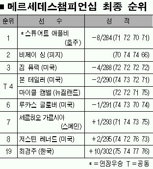 애플비는 9일 하와이주 카팔루아 플랜테이션골프장(파73·7411야드)에서 열린 대회 마지막 4라운드에서 2언더파 71타를 쳐 합계 8언더파 284타로 싱과의 연장전에 끌려갔지만 연장 첫 홀을 버디로 장식, 우승컵을 안았다.