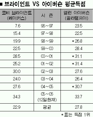 12일엔 두 별이 나란히 40점대를 터뜨렸다. 아이버슨은 유타전에서 46점, 브라이언트는 포틀랜드를 상대로 41점을 올리는 ‘난형난제’의 실력을 과시한 것. 이로써 브라이언트와 아이버슨의 평균득점은 각각 34.3점과 33.7점이 돼 하루 만에 0.8점차에서 0.6점으로 줄어들었다.