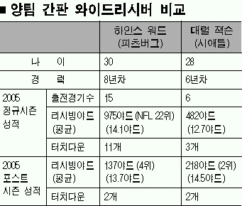 1998년 프로 진출 이후 줄곧 피츠버그에서만 뛰어 팀내에서 정신적 지주나 다름없다. 포스트시즌 3경기에서도 10개의 패스를 받아냈고 137야드를 전진,2개의 터치다운을 성공시켰다. 대한미식축구협회 송영호 심판협회장은 “워드는 상대 수비를 따돌린 뒤 볼을 잡는 실력이 뛰어나고, 또 결정적인 롱패스를 잡는 실력도 수준급”이라고 평가했다. 시애틀에서는 대럴 잭슨(28)이 워드의 맞수. 정규리그를 절반밖에 소화하지 못했지만 포스트시즌에서는 실력을 유감없이 뽐냈다.6년간 리시빙 1000야드를 넘긴 것이 3차례나 된다. 하인스가 슈퍼볼에 욕심을 내는 또 다른 이유는 한국인 어머니 때문이다. 효자로 소문난 워드는 오는 4월 어머니와 함께 한국을 방문할 계획이다.