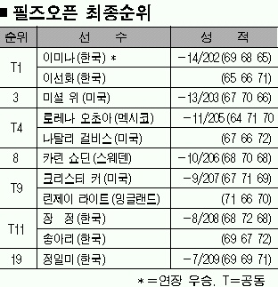 한국 선수끼리의 연장전. 지난주 SBS오픈 때와 흡사한 상황. 이번엔 이미나(25·KTF)와 이선화(19·CJ)였지만 승리는 마지막날 7언더파의 급상승세를 탄 이미나의 몫이었다. 전날까지 선두로 우승을 목전에 두고 있던 이선화는 단 1타를 줄이는 데 그쳐 연장전까지 끌려간 뒤 노련한 이미나에게 우승컵을 내줘야 했다.