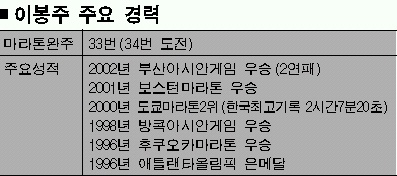 ‘국민 마라토너’ 이봉주(36·삼성전자)가 선수생활의 갈림길에서 승부수를 던졌다. 오는 5일 일본에서 열리는 비와코마라톤대회에 출전, 선수생명 연장 여부를 가늠할 예정이다.