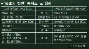 눈여겨 볼 점은 그의 방어율이 메이저리그 초유의 4시즌 연속 사이영상 수상을 했던 92∼95년(평균 2.24)에 비해 손색이 없다는 사실. 초반이긴 하지만 최근 2년 동안 4점대 방어율로 자존심을 구겼던 매덕스가 2년 만에 15승대 투수로 복귀할 것이라는 데는 이견이 없다. 매덕스는 88년부터 17년 내리 15승 이상을 쌓는 대기록을 세웠다. 지난해 13승으로 아쉽게 중단됐지만, 올해 이미 5승을 챙겨 19년 연속 두 자리 승수 정복을 위한 반환점을 돌아섰다.