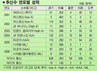 송재우 Xports해설위원은 “변화구에 약점이 있지만 경험이 해결해 줄 것”이라면서 “야구센스가 워낙 뛰어나 파워를 더 키운다면 20∼25홈런까지 가능하다.”고 내다봤다. 한편 서재응(29·탬파베이)은 이날 디트로이트전에서 6과 3분의2이닝 동안 7안타 4탈삼진 1실점으로 호투한 뒤 0-1로 뒤진 7회 2아웃에서 교체됐다. 탬파베이는 7회말 곧바로 2-1로 경기를 뒤집었다. 서재응으로선 아웃카운트 1개가 모자라 승리를 날린 셈.3승9패를 유지했고 방어율은 5.94에서 5.56으로 좋아졌다.