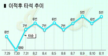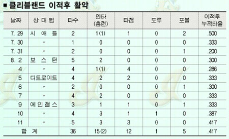 ‘증기 기관차’ 추신수(24)가 11일 오하이오주 클리블랜드 제이콥스필드에서 열린 LA에인절스와의 홈경기에서 5타수 3안타 3타점(1득점)으로 맹활약을 펼쳤다. 이틀 연속 한경기 3안타. 시애틀 시절 포함 시즌 타율은 전날 .310에서 .340(47타수 16안타)까지 뛰었다. 특히 이적 후 타율은 무려 .417(36타수 15안타). 추신수는 3회와 8회 상대 타자의 안타성 타구를 몸을 날려 잡아내는 호수비를 펼치기도 했다. 팀은 생애 첫 메이저 경기 MVP로 선정된 추신수의 활약에 힘입어 14-2로 대승,2연승을 달렸다.