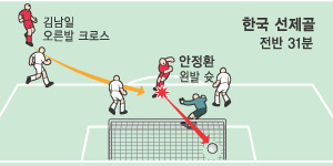 갈증을 달래준 주인공은 부동의 해결사 안정환이었다. 전반 31분 상대 미드필드 진영에서 ‘진공 청소기’ 김남일(29·수원)이 오른발로 문전을 향해 크로스를 올렸다. 쇄도하던 안정환은 공을 논스톱 왼발로 걷어올려 달려 나오던 상대 골키퍼를 살짝 넘기며 재치 있게 득점에 성공했다. 이후 경기는 풀렸다.