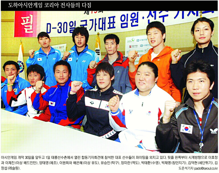 D-30 행사로 열린 이날 선수단 합동기자회견에서 이들은 저마다 ‘최다의 노력을 통한 최고의 기록’을 다짐하며 아시안게임을 너머 2년 뒤 베이징올림픽에서의 선전까지 약속했다. 정현숙(54) 선수단장도 “전체 39개 종목 가운데 29개 종목에서 모두 73개의 금메달을 획득, 일본을 따돌리고 3회 연속 종합 2위를 사수하는 것이 목표”라고 재확인했다.