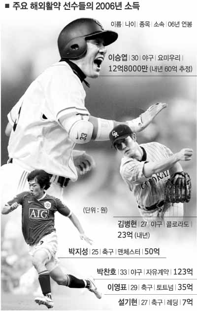 4년간 30억엔(240억원)의 ‘대박’을 터뜨린 이승엽의 내년 연봉은 정확히 밝혀지지 않았다. 하지만 현지 언론들은 6억 5000만엔(52억원·요미우리 인터넷판)에서 최대 7억 5000만엔(60억원·교도통신) 선으로 추정했다. 이는 기존 해외파 스타들의 내년 수입을 뛰어넘을 것으로 보여 관심이다.