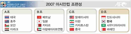 47년 만에 아시안컵 우승을 노리는 한국은 19일 말레이시아 쿠알라룸푸르 컨벤션센터에서 열린 2007 아시아축구연맹(AFC) 아시안컵 본선 조추첨에서 공동개최국 인도네시아와 중동의 강호 사우디아라비아, 바레인과 함께 D조가 됐다.