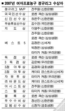 한국 여자농구의 간판 가드 전주원이 20일 서울 웨스틴조선호텔에서 열린 2007년 여자프로농구 겨울리그 정규리그 시상식에서 최우수선수(MVP)로 뽑혔다. 기자단 투표에서 73표 가운데 59표를 얻었다. 그는 19경기에 나와 경기당 평균 6.79개의 어시스트를 낚아 이 부문 4회 연속 1위에 오르는 한편 팀의 정규리그 우승을 이끌었다.