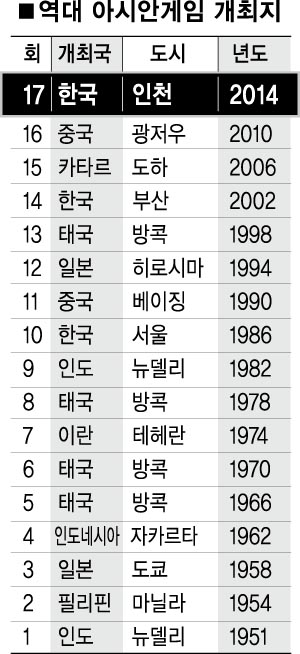 인천이 대회 유치에 성공할 경우 1986년 서울과 2002년 부산에 이어 한국 도시로는 세 번째로 대회를 개최하게 된다.2003년 체코 프라하 국제올림픽위원회(IOC) 총회에서 강원 평창이 2010년 겨울올림픽 유치에 단 3표 차로 실패하면서 추락하기 시작한 국제스포츠 무대에서의 위상도 되살릴 계기를 잡게 된다.2003년 대구 하계유니버시아드를 끝으로 국제종합대회 공백기를 맞았던 한국 스포츠는 지난달 대구가 세계육상선수권을 유치한 데 이어 인천과 평창이 2014년 각각 아시안게임과 겨울올림픽 유치에 성공할 경우 ‘트리플 크라운’으로 화려하게 살아난다.