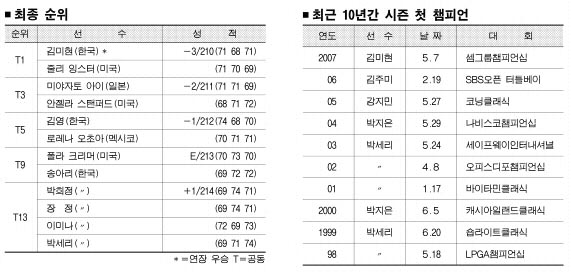 김미현(30·KTF)이 7일 오클라호마주 브로큰애로의 시더리지골프장(파71·6602야드)에서 막을 내린 미여자프로골프(LPGA)투어 셈그룹챔피언십 4라운드에서 ‘백전 노장’ 줄리 잉스터(미국)를 제치고 우승컵을 품었다. 이븐파에 그쳤지만 합계 3언더파 210타로 잉스터를 공동 선두로 따라붙은 뒤 연장 첫번째 홀에서 잉스터를 따돌렸다. 지난 7개 대회 동안 한 차례도 우승을 낚지 못해 “집단 무기력증에 빠졌다.”는 눈총을 받아온 ‘코리안 파워’의 목마름을 풀어낸 시원한 첫 승.