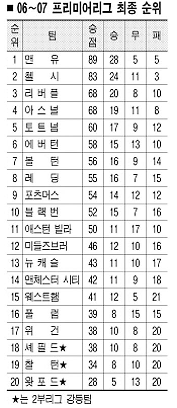 맨유와 첼시가 프리미어리그 1,2위에 올라 07∼08시즌 UEFA 챔피언스리그 본선 진출을 확정했다. 각각 3위와 4위에 그친 리버풀과 아스널은 챔피언스리그 예선을 거쳐 본선에 도전하게 된다. 특히 프리미어리그 ‘빅4’인 이 팀들은 4시즌 연속 챔피언스리그에 동반 출전을 하게 됐다.5∼7위에 오른 토트넘과 에버턴, 볼턴은 UEFA컵 티켓을 손에 넣었다.