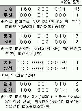 잠실에서는 전날 11회 연장 끝에 무릎을 꿇었던 두산이 서울 라이벌 LG에 올시즌 팀 최다인 21안타를 퍼부어 15-1로 대승을 거뒀다. 올시즌 최다 점수차 승리. 두산은 1,2회에만 7안타를 퍼부어 7-0으로 달아나며 일찌감치 승부를 결정지었다.