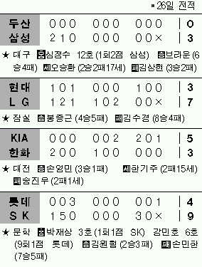 SK도 문학에서 선발 전원 안타의 불방망이로 롯데를 9-4로 제치고 6연승 콧노래를 부르며 선두를 고수했다. 롯데는 에이스 손민한이 1과 3분의2이닝 동안 4안타 3볼넷 6실점으로 주저앉는 바람에 초반에 무너졌다.