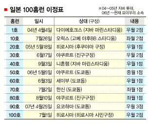 지난 20일 지바 롯데전 이후 ‘아홉수’에 걸렸다가 11일째 6경기 만에 대포를 가동한 이승엽은 이로써 일본 통산 100호 홈런을 기록했다.2004년 지바 롯데 유니폼을 입은 뒤 3년6개월,432경기,1545타수 만이다. 한·일 통산 424호. 또 일본프로야구 사상 250번째, 역대 외국인 선수 가운데 51번째, 현역 외국인 선수 가운데 8번째. 한국인으로는 장훈(504개), 백인천(209개)에 이어 세 번째. 요미우리를 대표하는 방망이인 오 사다하루(563경기·현 소프트뱅크 감독), 나가시마 시게오(504경기·현 요미우리 종신 명예감독), 마쓰이 히데키(468경기·현 뉴욕 양키스)보다도 빠른 페이스. 팀의 역대 세 번째 최소경기 기록.