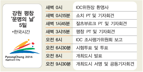 강원 평창의 2014년 겨울올림픽 유치 여부 결정이 하루 앞으로 다가온 가운데 국제올림픽위원회(IOC)는 5일(한국시간) 투표에 97명의 위원이 참가한다고 3일 밝혔다. 이에 따라 평창은 49표 이상을 얻어야 1차 투표에서 승리할 수 있다. 평창은 위원들에 대한 막판 맨투맨 설득에 박차를 가했다.