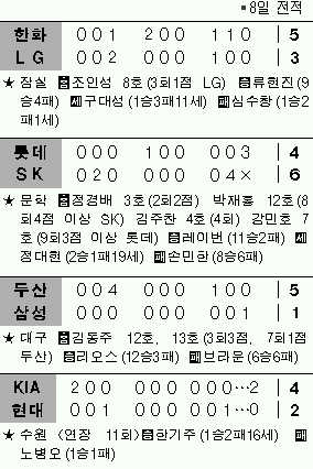 한화는 잠실에서 류현진이 5와 3분의1이닝 동안 6안타(1홈런) 4볼넷 3탈삼진 2실점 호투와 고비 때마다 터진 타선에 힘입어 LG의 추격을 5-3으로 뿌리치고 2위를 지켰다.KIA는 수원에서 현대와 2-2로 맞선 연장 11회 1사 1·2루에서 한규식의 적시 2루타로 4-2 역전승을 거둬 오랜 만에 승리의 기쁨을 누렸다.