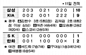 삼성은 광주에서 KIA의 끈질긴 추격을 뿌리치고 10-9로 어렵게 이겼다. 삼성은 올시즌 처음으로 선발 전원 안타를 기록, 오랜만에 활발한 공격을 선보였지만 범실 3개를 내는 등 엉성한 수비 탓에 큰 점수를 내고도 역전 위기까지 몰렸다.