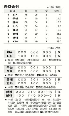 삼성은 수원에서 6-6으로 맞선 연장 12회 10점을 뽑아내는 핵타선을 자랑하며 현대를 16-6으로 대파했다.16점은 올시즌 한 팀이 올린 최다 득점. 두산의 선발 다니엘 리오스는 문학에서 SK에 1-0 완봉승을 거두며 거침없이 11연승을 내달렸다. 올시즌 3번째 완봉승을 올린 리오스는 9이닝 동안 2안타 1볼넷 완벽투로 13승(3패)째를 품었다. 리오스는 방어율도 1.60으로 끌어내려 다승과 함께 이 부문 1위를 지켰다.