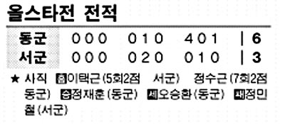 서군은 이택근(현대)이 0-1로 뒤진 5회 1사3루에서 올스타전 사상 처음으로 그라운드 홈런을 때리며 2-1로 역전, 상승세를 타는 듯했지만 7회 4점을 내주며 주저앉았다.2군 선수로는 처음으로 올스타전에 출전한 이종범(KIA)은 1득점을 올려 4타수 무안타의 아쉬움을 달랬다.