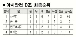 한국은 18일 자카르타의 겔로라 붕카르노 경기장에서 열린 홈팀 인도네시아와의 D조 3차전에서 김정우의 통렬한 중거리포 선제골을 끝까지 지켜 1-0으로 간신히 승리했다. 이로써 한국은 1승1무1패로 승점 4를 챙겼지만 같은 시간 팔렘방의 자카 바링 경기장에서 사우디아라비아가 바레인에 4-0 대승을 거둔 데 힘입어 인도네시아, 바레인(이상 1승2패·승점 3)을 제치고 조 2위로 8강에 합류했다.