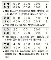 현대는 문학에서 장단 10안타로 10점을 내는 효과적인 공격력을 발휘,SK를 10-5로 제쳤다.SK 선발 케니 레이번은 5와 3분의2이닝 동안 6실점, 다승 경쟁자 리오스와 동반 패전 투수가 됐다.4패(12승)째. 한화는 대전에서 LG에 5-4 역전승,3연패를 끊었다. 하위권끼리 맞붙은 광주에선 올시즌 9이닝 최장인 4시간31분 혈투 끝에 롯데가 4연승을 노린 KIA를 15-8로 대파했다.23점은 올시즌 1경기 최다 점수.