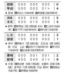 LG의 마무리 우규민은 9회 삼자범퇴로 24세이브(1승)째를 챙기며 이날 블론세이브를 기록한 이 부분 1위 오승환(4승3패25세)을 1세이브차로 쫓아갔다.