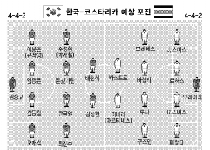 특히 코스타리카의 오른쪽 풀백이 잦은 공격가담으로 뒷공간을 내주는 데다 수비 전환이 느린 점을 노려야 한다. 골키퍼 레오넬 모레이라도 단신(175㎝)인 데다 판단능력이 떨어져 윤빛가람 등의 과감한 중거리슛도 효과적일 것으로 분석된다.