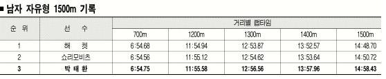 한국 수영의 ‘대들보’ 박태환(18·경기고)의 1500m 3위에 담긴 뜻은 무엇일까. 이틀 전 일본 지바 국제종합수영장에서 벌어진 프레올림픽인 일본국제수영대회 남자 자유형 400m에서 ‘지존’의 자리에 등극한 박태환이 23일 자유형 1500m에서는 ‘10년 장거리의 황제’ 그랜트 해켓(호주), 올해 세계선수권 챔피언 마테우츠 쇼리모비츠(폴란드)에 밀려 동메달에 그쳤다.