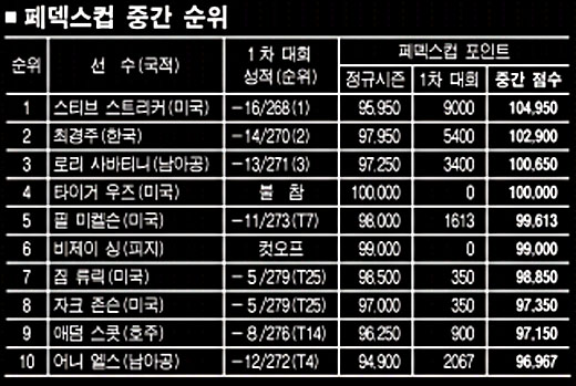 비록 우승컵은 스티브 스트리커(미국·16언더파)에 넘겨 줬지만 4개 대회 포인트로 1000만달러의 주인을 가리는 페덱스컵 시리즈 첫 관문을 묵직한 중량감으로 통과, 향후 3개 대회 선전을 예고했다. 당초 지난 36개 대회 성적에 따라 페덱스컵 포인트 랭킹 5위(9만 7500점)로 출발한 최경주는 이날 성적에 따라 5400점을 추가,10만 2900점으로 플레이오프 랭킹 2위까지 훌쩍 뛰어올랐다.