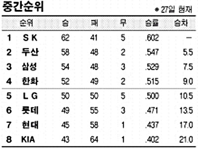 프로야구 페넌트레이스가 막판으로 치달으면서 4강 티켓 한 장을 놓고 ‘석양의 결투’가 벌어진다.27일 현재 선두 SK가 2연패에 빠졌지만 2위 두산과의 승차를 5.5경기로 유지, 사실상 한국시리즈(KS) 직행 티켓을 예약했다.2위 두산과 3위 삼성은 1.5경기 차로 플레이오프(PO) 직행 티켓을 놓고 치열한 싸움을 벌이고 있다.