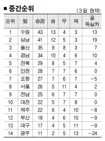 최근 4경기 연속 무승(1무3패)을 끊어 분위기를 추슬렀지만 앞으로 상황이 더 좋지 않다. 아시아축구연맹(AFC) 챔피언스리그 8강전(19·27일)이 끼어 있어 부담스럽다.