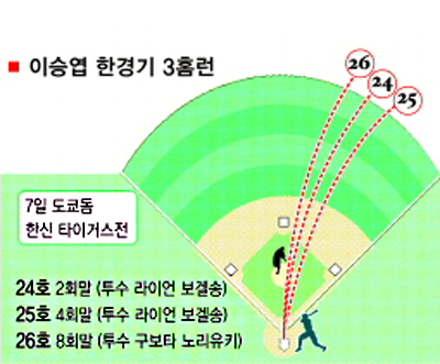 이승엽은 7일 도쿄돔에서 열린 일본프로야구 한신과의 홈 경기에 1루수 겸 6번 타자로 선발 출장,2회와 4회 연타석 홈런을 날린 데 이어 8회에도 대포를 가동했다. 지난달 31일 요코하마전 이후 1주일 만에 터진 시즌 24·25·26호이다. 특히 이승엽은 최근 절친한 홍성흔(두산)과 전화통화에서 “엄지가 곪아가고 있다.”고 밝힐 정도로 왼속 손가락 부상이 악화되는 가운데 출전을 강행하는 투혼을 발휘하며 ‘몰아치기’의 진수를 선보였다.