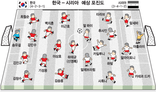 지난 9일 새벽 바레인 원정경기를 치르고 10일 오후 귀국한 한국은 시차적응도 제대로 되지 않은 상태다. 때문에 이번에 극복해야 할 대상은 시리아가 아니라 안방이지만 원정 같은 상황에 처한 ‘자신’일 수도 있다. 다행히 2차전에서 경고 누적으로 빠졌던 ‘해결사’ 이근호(대구)와 최철순(전북), 이승현(부산)이 돌아와 힘을 보탠다. 시리아전 화두는 시원한 다득점이다. 이를 위해 이근호와 김승용(광주)이 좌우 날개로 나와 상대 진영을 헤집을 예정이다. 최근 스트라이커들의 컨디션이 그다지 좋지 않기 때문에 이들의 활발한 플레이가 중요하다. 이근호는 올림픽 예선 3경기 연속 득점에 도전한다. 그는 2차예선 최종전에서 아랍에미리트연합(UAE)을 상대로 2골을 터뜨렸고, 최종예선 우즈베키스탄과의 1차전에서도 역전 결승골을 뽑아내 올림픽팀의 연승 질주를 채찍질했다.