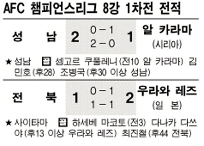 성남은 19일 탄천종합운동장에서 벌어진 아시아축구연맹(AFC) 챔피언스리그 8강 1차전 알 카라마(시리아)와의 홈경기에서 전반 선제골을 내준 뒤 후반 2분새 터진 김민호와 조병국의 연속골로 통쾌한 2-1 역전승을 일궜다.