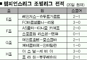 H조에서는 아스널(잉글랜드)이 세스크 파브레가스와 로빈 판 페르시, 에두아르두 다실바의 릴레이 골로 세비야(스페인)를 3-0으로 완파, 조 선두에 나섰다. 슬라비아 프라하(체코)는 스테아우아 부쿠레슈티(루마니아)를 2-1로 제압했다.G조에선 PSV에인트호벤(네덜란드)이 CSKA 모스크바(러시아)를 2-1로 눌렀고, 페네르바체(터키)가 홈에서 인터 밀란(이탈리아)을 1-0으로 눌렀다.