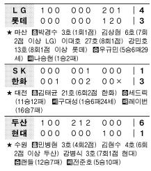 LG는 마산에서 끈질긴 추격을 뿌리치고 롯데를 4-3으로 제압했다.LG는 지난달 28일 이후 롯데전 6연승의 휘파람을 불었다. 롯데 이대호는 시즌 27호를 기록, 심정수(삼성)과 홈런 공동 2위에 올랐다.