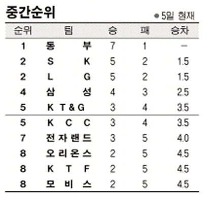 프로농구 원주 동부가 초반 선두를 질주하고 있다.6연승,7승1패로 공동 2위 LG·SK와 1.5경기 차.