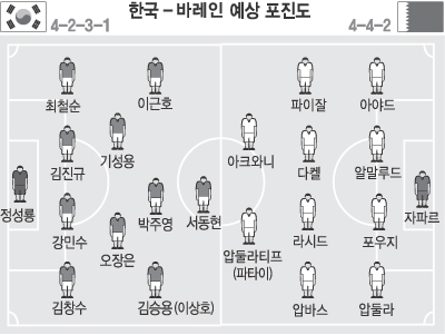 17일 우즈베키스탄에 무기력하게 비긴 것이 허리가 부실한 탓이란 자가진단 끝에 기성용(서울)과 오장은(울산) 등 미드필더에겐 바레인의 ‘귀화 2인방’을 꽁꽁 묶는 데 집중하도록 했다. 바레인은 지난 9월9일 박성화호가 1-0으로 제압했던 그 팀이 아니다. 최종예선 5차전까지 바레인이 뽑아낸 7골의 절반을 책임진 나이지리아 출신 공격수 제이시 존 아크와니와 압둘라 파타이가 그때는 각각 부상과 경고누적을 이유로 빠졌지만 이번엔 선봉에 서기 때문. 파타이도 아크와니와 2차예선 3골을 합작한 득점원. 둘 외에도 차드 출신 압둘라 오마르도 우즈베키스탄과의 최종예선 3,4차전에서 연속골을 기록해 경계해야 할 인물.