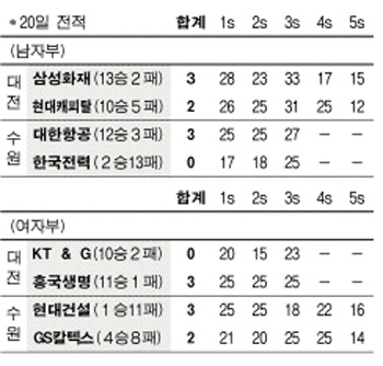 여자부 꼴찌 현대건설은 수원에서 GS칼텍스를 제물 삼아 지긋지긋한 11연패의 늪에서 헤어났다.2패만 더 당하면 전 LG정유의 최다 연패 기록(13패)의 수모를 당할 처지였던 현대건설은 티파니 도드의 활약으로 두 세트를 먼저 벌어들인 뒤 GS칼텍스의 거센 저항에 멈칫했지만 5세트 13-14의 위기에서 상대 김민지의 네트터치로 듀스를 만든 뒤 티파니가 매치포인트를 만들고 김민지의 스파이크가 벗어나 감격의 시즌 첫 승을 만끽했다.